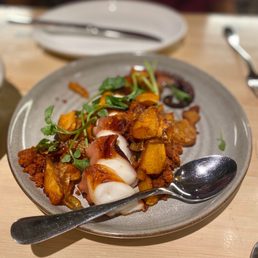 I am so glad my friend told me about this restaurant! There were 4 of us on a Friday night for dinner, I believe only one person in our party had been there before. Apparently they have new menu items since the last time she was there. It was full for dinner in the main room by the time we left, plus the back room was full with at least one very large group. There's an upstairs area that can be used for private events but we didn't have a chance to take a look. There are also a couple of small tables outside. Convenient location, lovely space, delicious creative house cocktails (with cool names!), delicious and beautifully presented food (and good portions!). The staff was attentive and friendly and helpful. They have an extensive wine list and were able to answer questions/make suggestions to those of us having wine. If I were to label the cuisine, I would say "upscale Mediterranean." According to Amali's website the menu reflects the historical cuisines shared by modern day Greece, Italy, France, and Spain. Note their service model (which is mentioned in the beginning of their menu) - they include an 18% hospitality surcharge in order to pay their staff above-market wages for service workers. To drink I had the "October in Astoria" because I was in a bourbon mood. It was really great! My friend prefers gin and had the "Easy Virtue". The 4 of us shared everything - started with the autumn squash hummus and roasted sunchokes. For mains - we were told when we first sat down that there were only two ducks left so we reserved one. It is on the menu as "entrees for two" but it would easily be enough for 4 people if you also share an appetizer or two. The spice roasted duck was PHENOMENAL and unlike any preparation of duck any of us had eaten before. It includes spiced duck plus duck kofta (made from the duck leg?), plus homemade pancakes and veggies and jalapeno yogurt sauce on the side. As a main it comes with two sides - we chose the fingerling potatoes (prepared crispy and way better than we expected!) and the brussels sprouts. - apparently some of the fresh pastas on the menu are new. We decided to go with the short rib cappelletti - it melts in the mouth OMG. After that much food (the duck was a large portion!) we unfortunately did not have room for dessert.